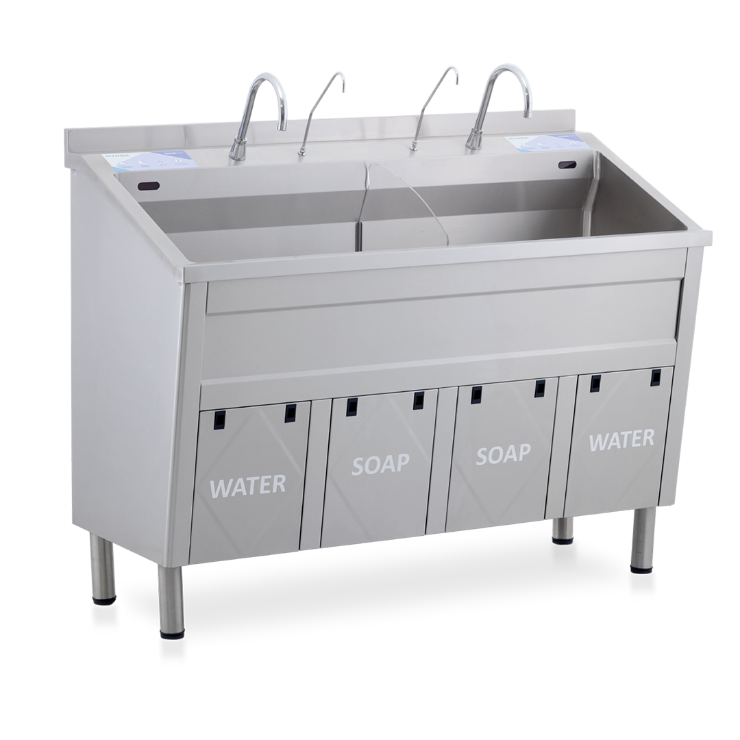 It has a photocell display screen on which the temperature and duration of the water flowing from each battery are monitored alternately. It has a rounded concave corner in accordance with international hygienic norms, taking to consideration the usage areas and user requests. It provides ease of use with the water flow controlled by the panel and the soap flow controlled by the knee panel. It has an internal thermostatic valve that allows the water temperature to be adjusted according to the user’s request.